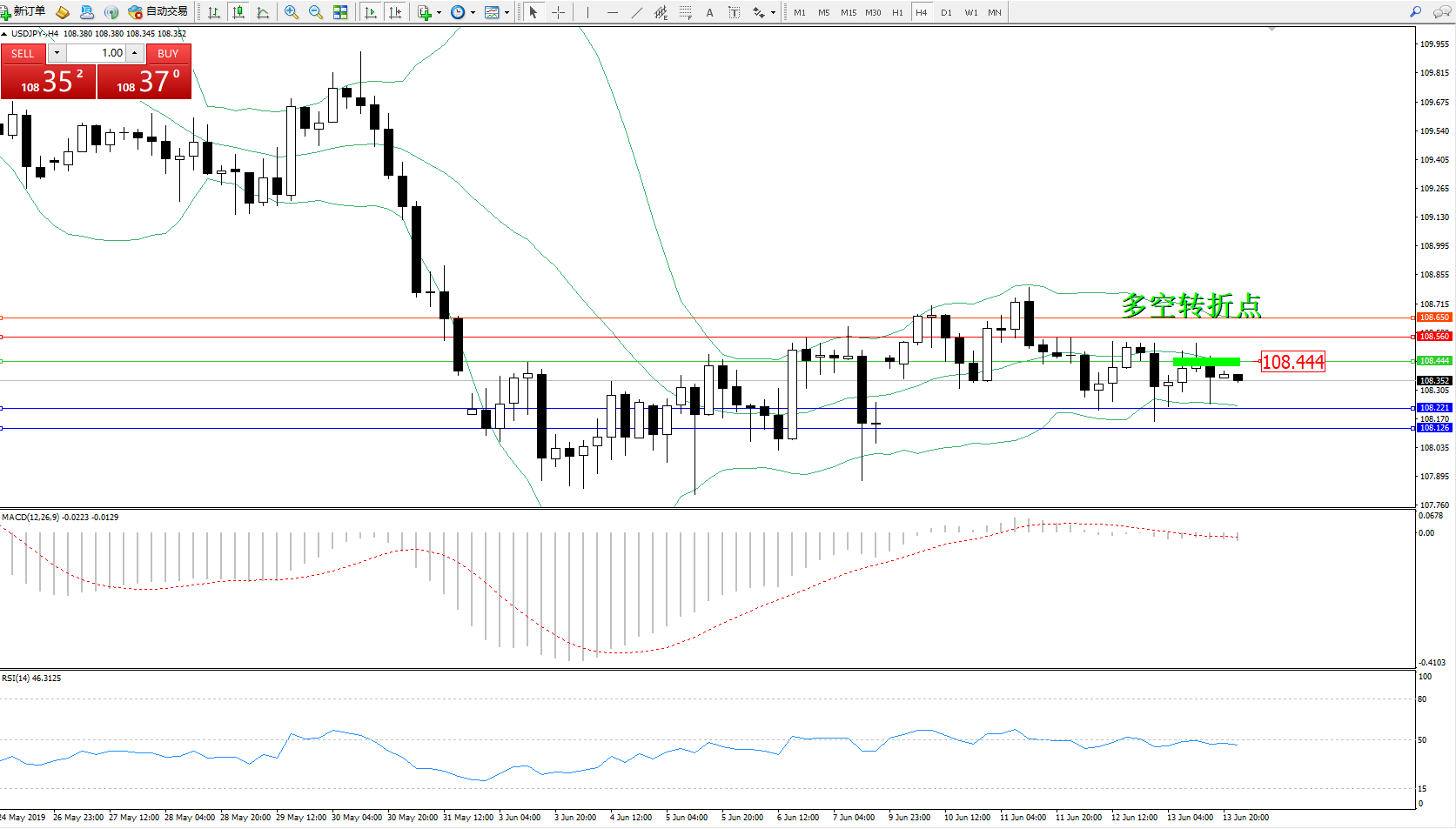 交易策略:108.444下方看跌,目标108.221、108.126
