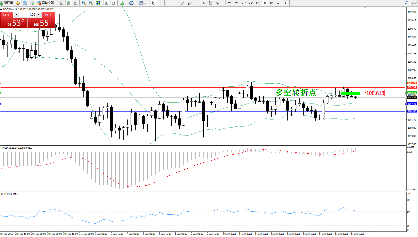 交易策略:108.613下方看跌,目标108.432、108.308