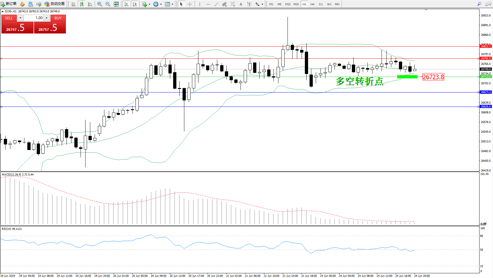 道琼斯指数DJ30—— 1小时K线图显示: