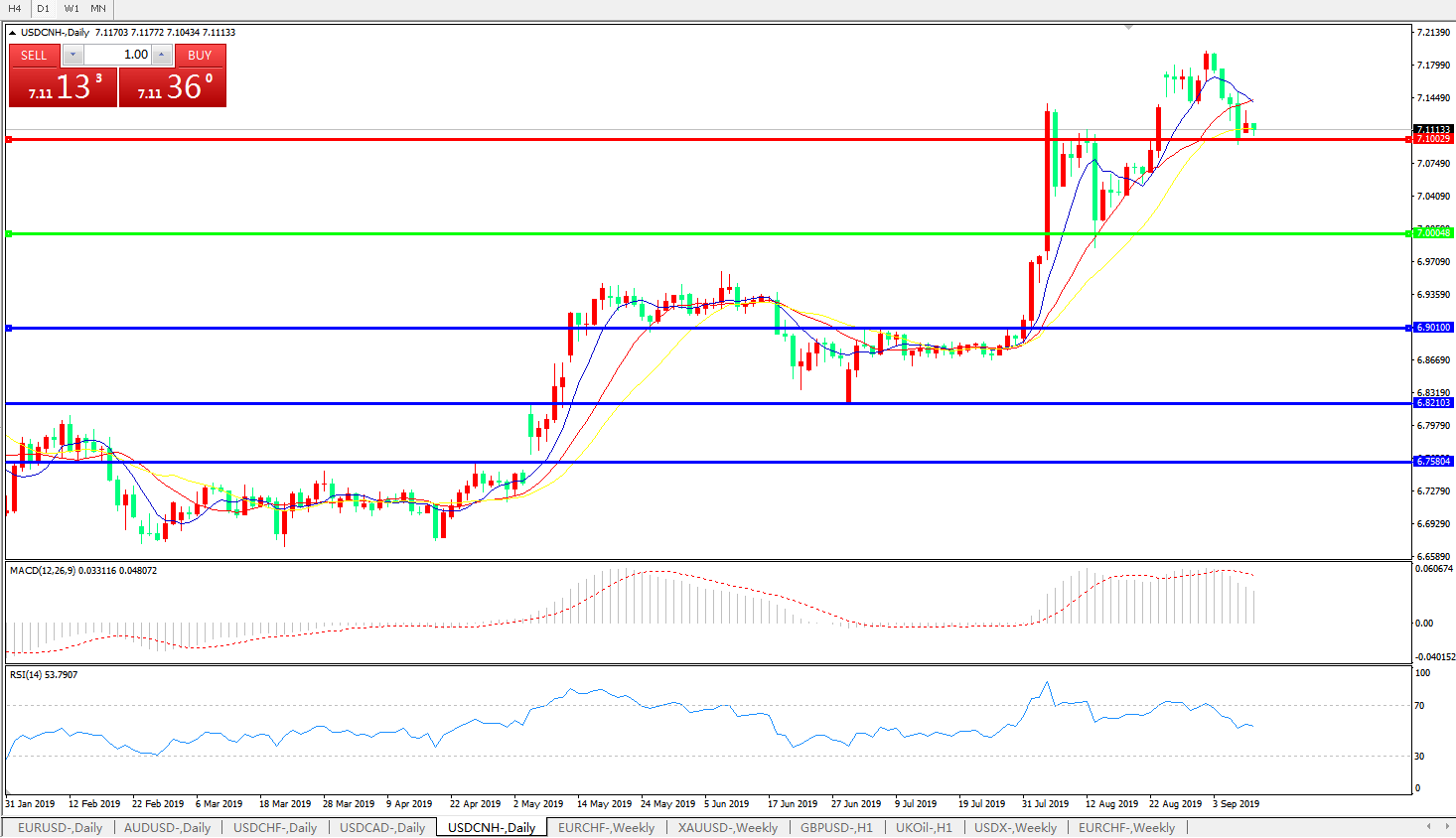 技术面简析:日图均线呈有序多头排列但短期均线快速走弱,汇价近日呈弱势盘整态势,MACD运行在0轴上方但动能有缩量迹象,RSI自超买区域持续下行,预计短期汇价将继续回落下行,上方重点关注7.20-7.30区间的压制;中美贸易谈判后续进展决定汇价中期走势。