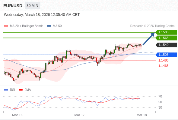 在 1.1505 之上,看涨,目标价位为 1.1565 ,然后为 1.1585 。