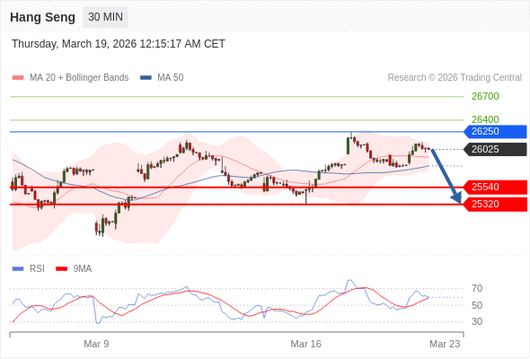 恒生指数 当日内: 目标位为25540。