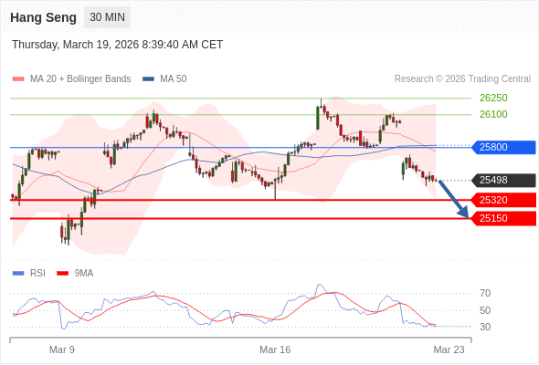 恒生指数 当日内: 存在压力。