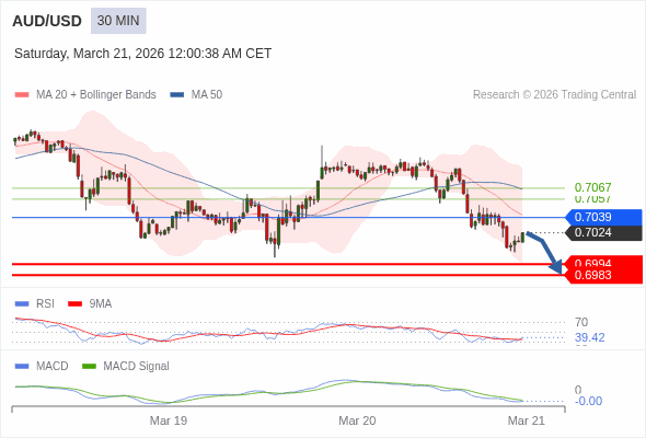 澳元/美元 当日内 : 看跌,在 0.7039 之下。