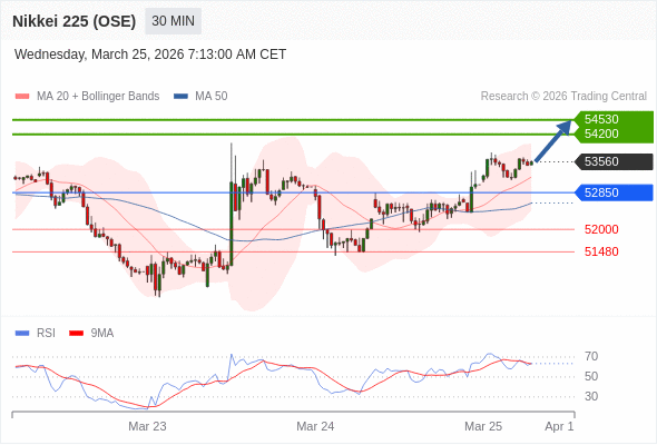 在 52850 之上,看涨,目标价位为 54200 ,然后为 54530 。
