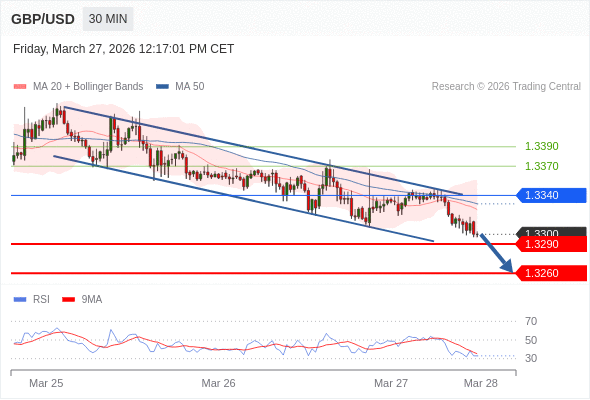 交易策略: 在 1.3340 之下,看跌,目标价位为 1.3290 ,然后为 1.3260 。