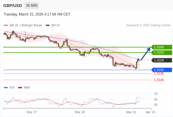 在 1.3155 之上,看涨,目标价位为 1.3250 ,然后为 1.3280 。