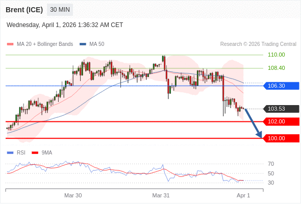 布伦特原油 (ICE) (M6) 当日内: 目标为100.00。