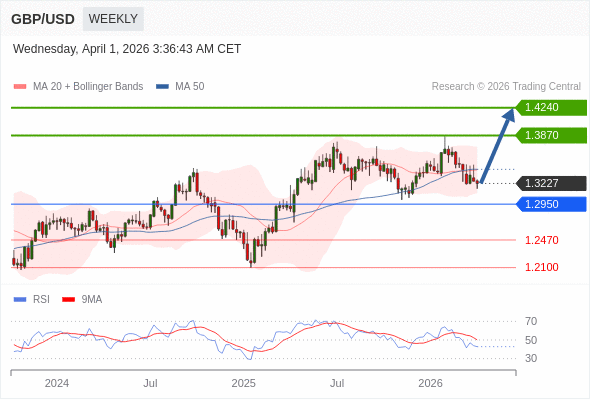 在 1.2950 之上,看涨,目标价位为 1.3870 ,然后为 1.4240 。