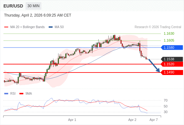 在 1.1580 之下,看跌,目标价位为 1.1520 ,然后为 1.1490 。