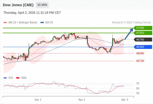 在 46390 之上,看涨,目标价位为 47050 ,然后为 47280 。