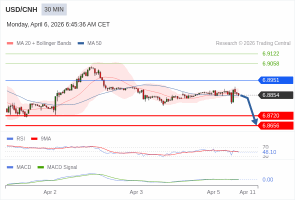 交易策略: 逐渐下跌,当 6.8951 阻碍上行,则 6.8656 为目标位。