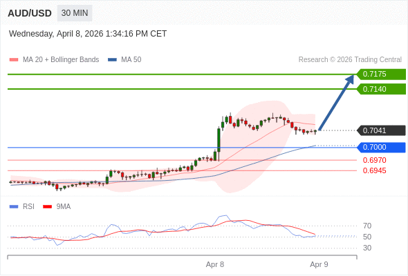 在 0.7000 之上,看涨,目标价位为 0.7140 ,然后为 0.7175 。
