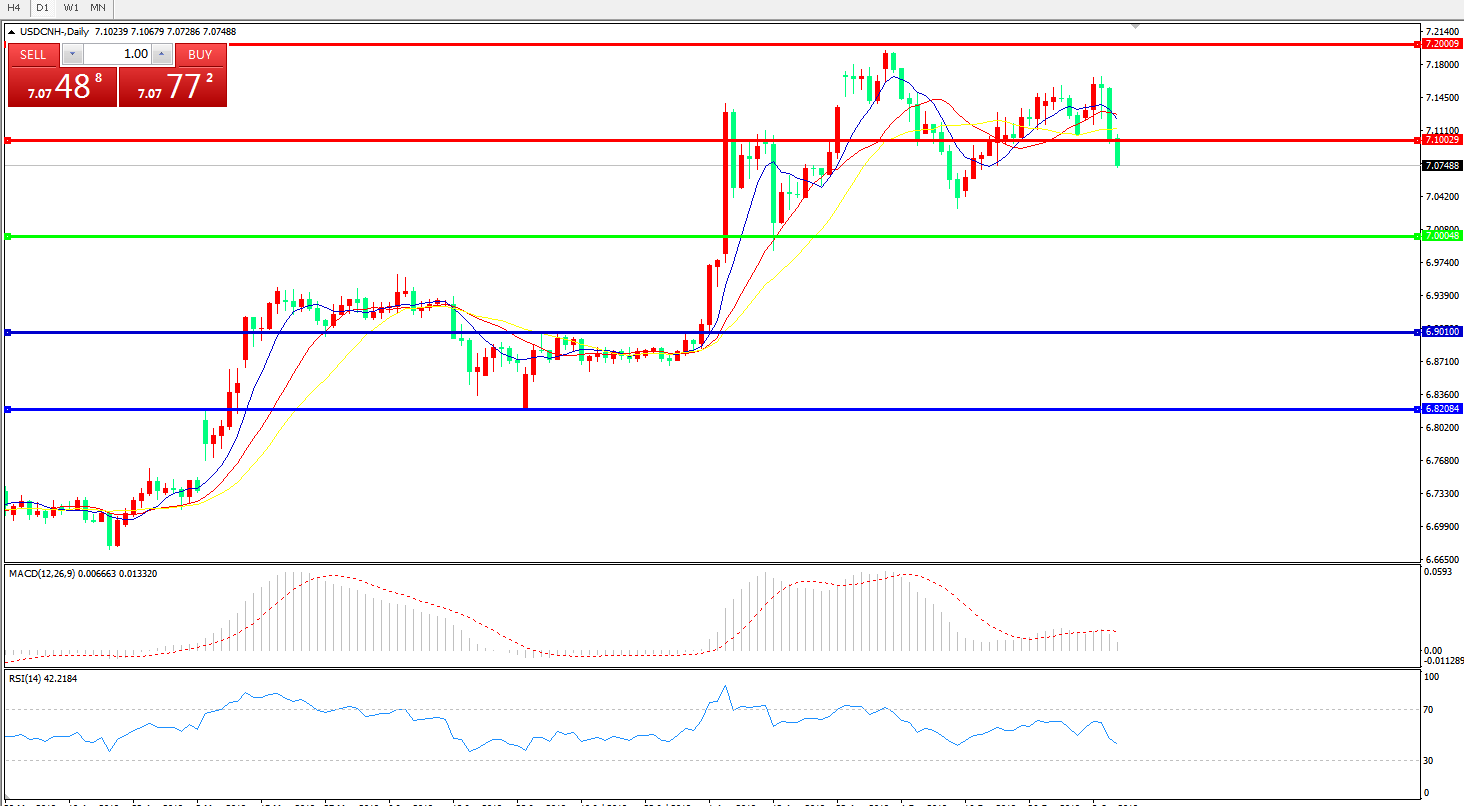 技术面简析:日图短期均线快速拐头下行,汇价骤跌破位7.10关口并持续下行,MACD运行于0轴上方但量能快速缩量,RSI快速走低,预计短期汇价将进一步下行,短期汇价运行于7.00-7.10区间的概率较大;中美贸易后续谈判进展将决定汇价最终趋势。