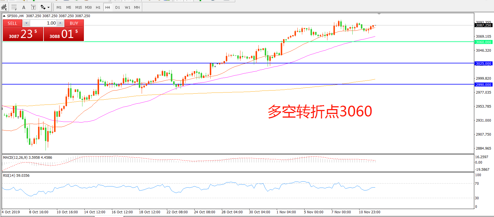 4小时图看,标普500维持高位震荡,整体依然处于多头趋势,均线系统呈多头排列,MACD红柱减少,RSI指标走平,日内震荡上行概率较大。