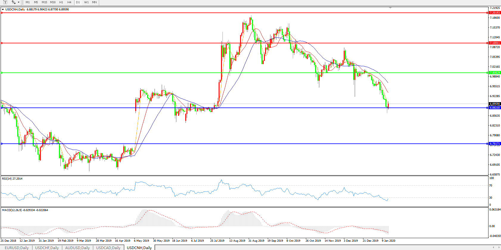 交易策略: 在7.0000之下,看跌,目标价位为6.8820,然后为6.7600。