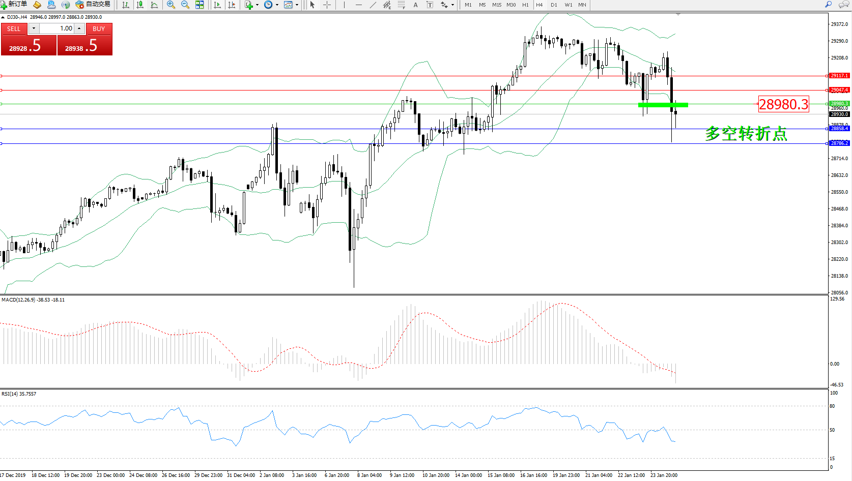 交易策略:28980下方看跌,目标28858、28786