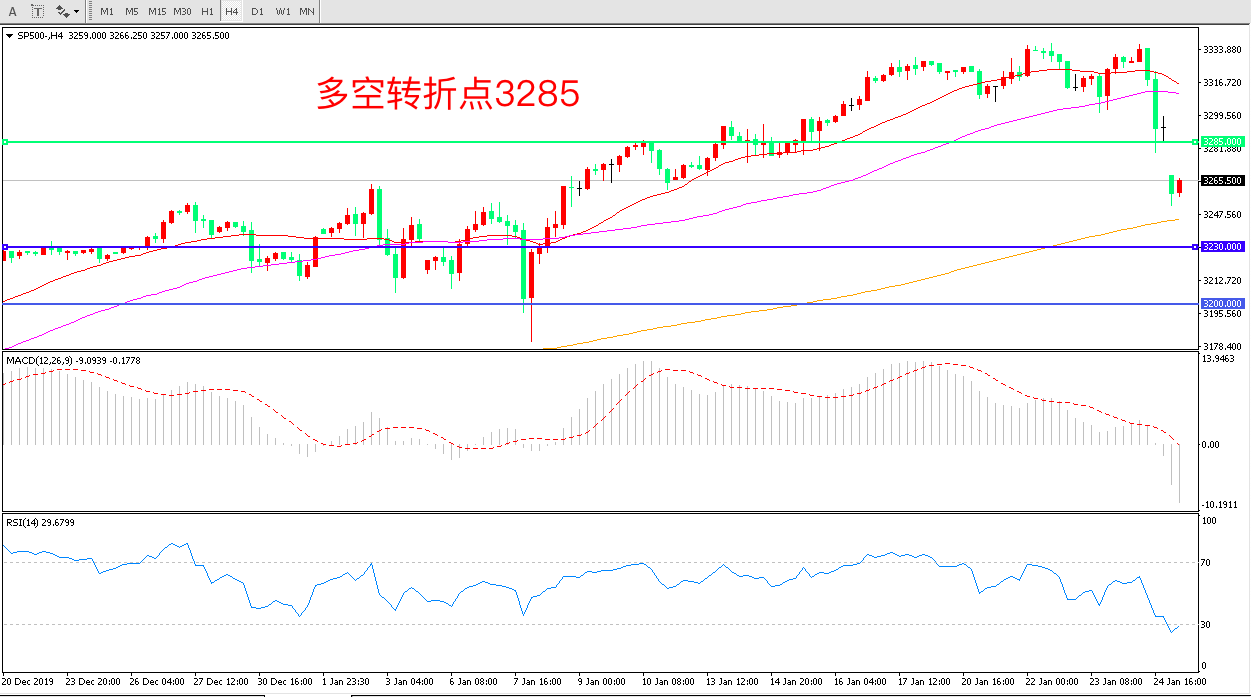 4小时图看,标普500跳空低开短期走势有所回调日内重点关注3285附近是否能够收复