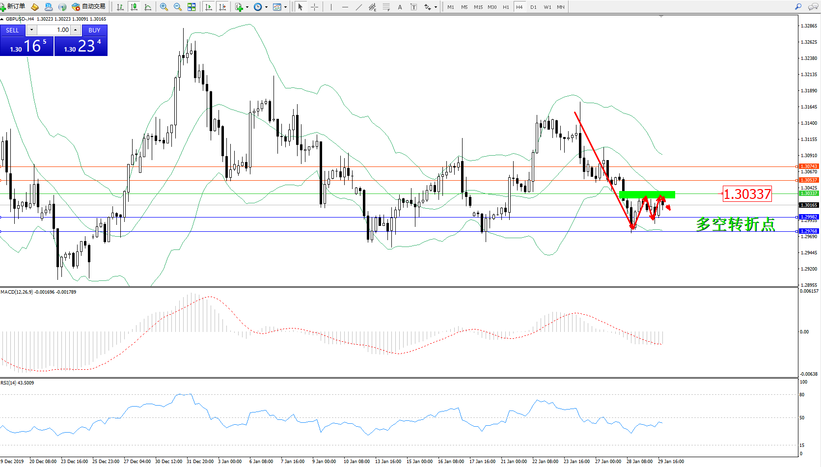 交易策略:1.30337下方看跌,目标1.29982、1.29768