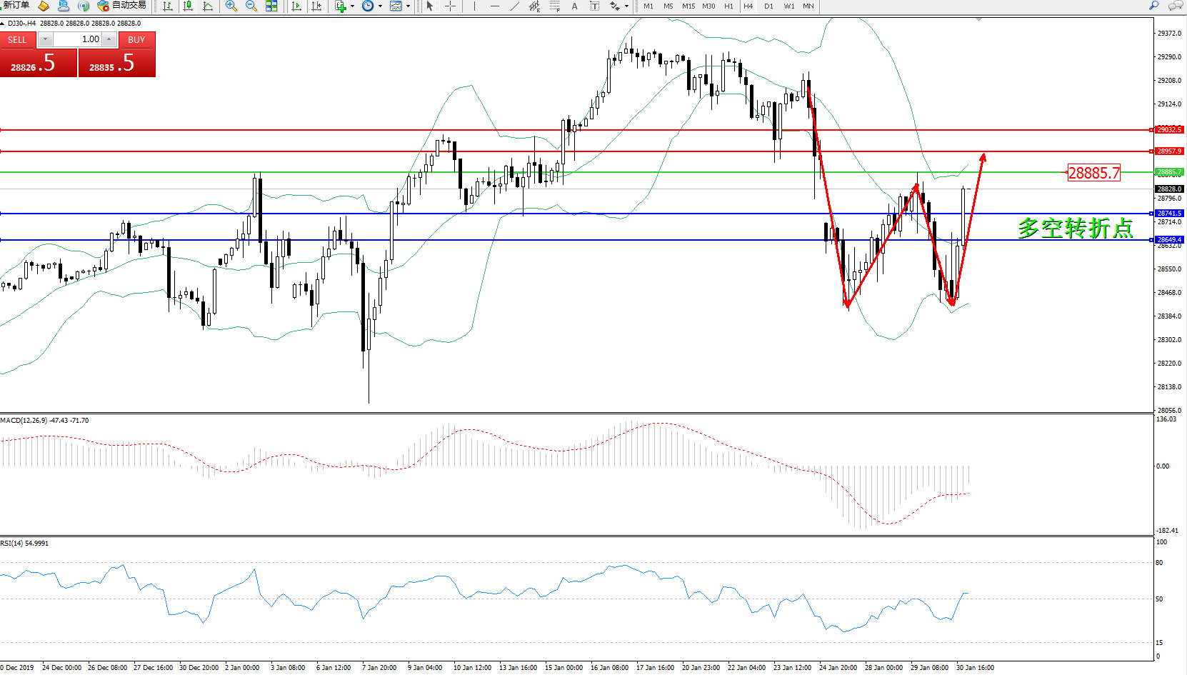 交易策略:28885下方看跌,目标28741、28649