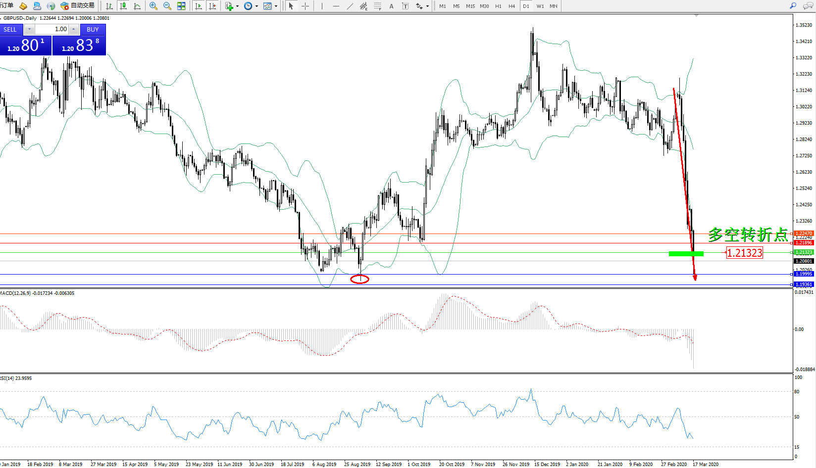 交易策略:1.21323下方看跌,目标1.19995、1.19361