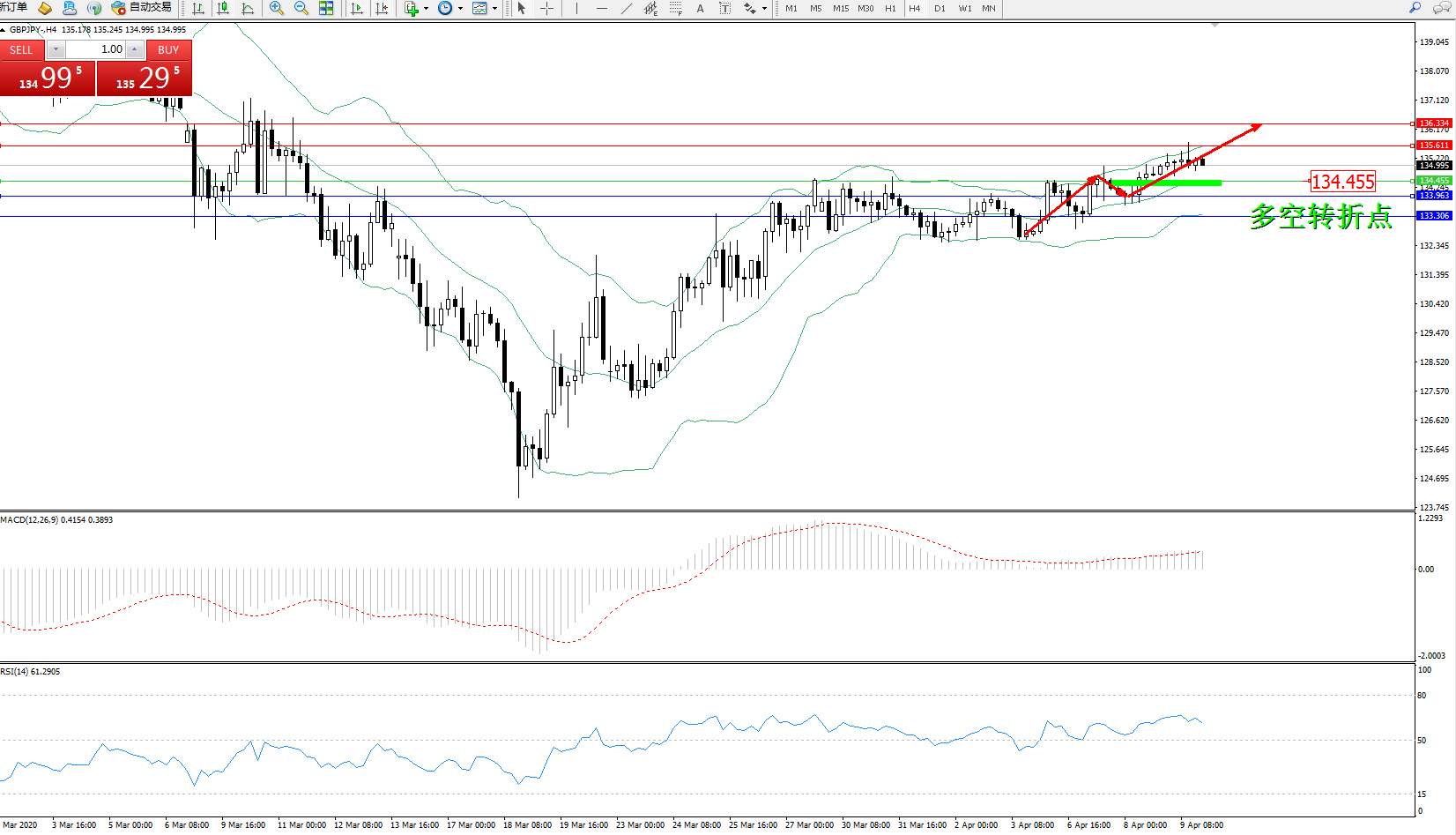 交易策略:134.455上方看涨,目标135.611、136.334