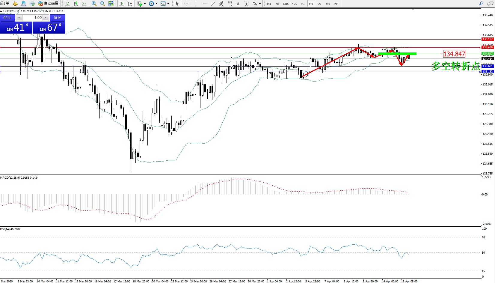 交易策略:134.847下方看跌,目标133.681、133.182