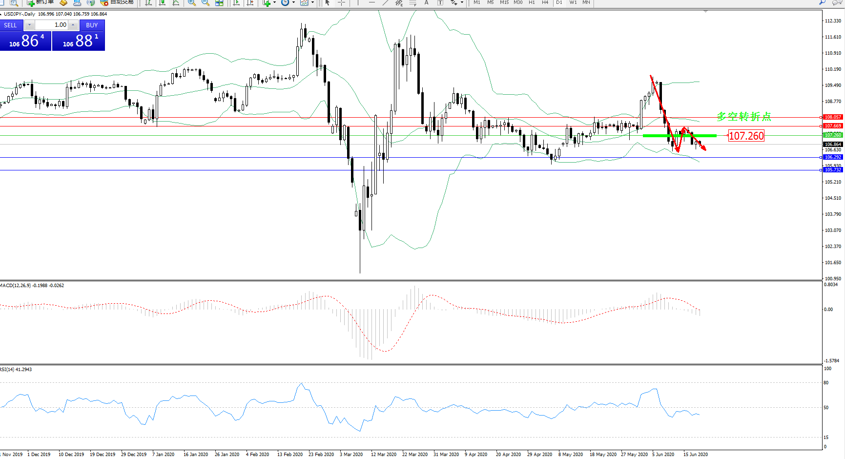 交易策略:107.260下方看跌,目标106.292、105.732