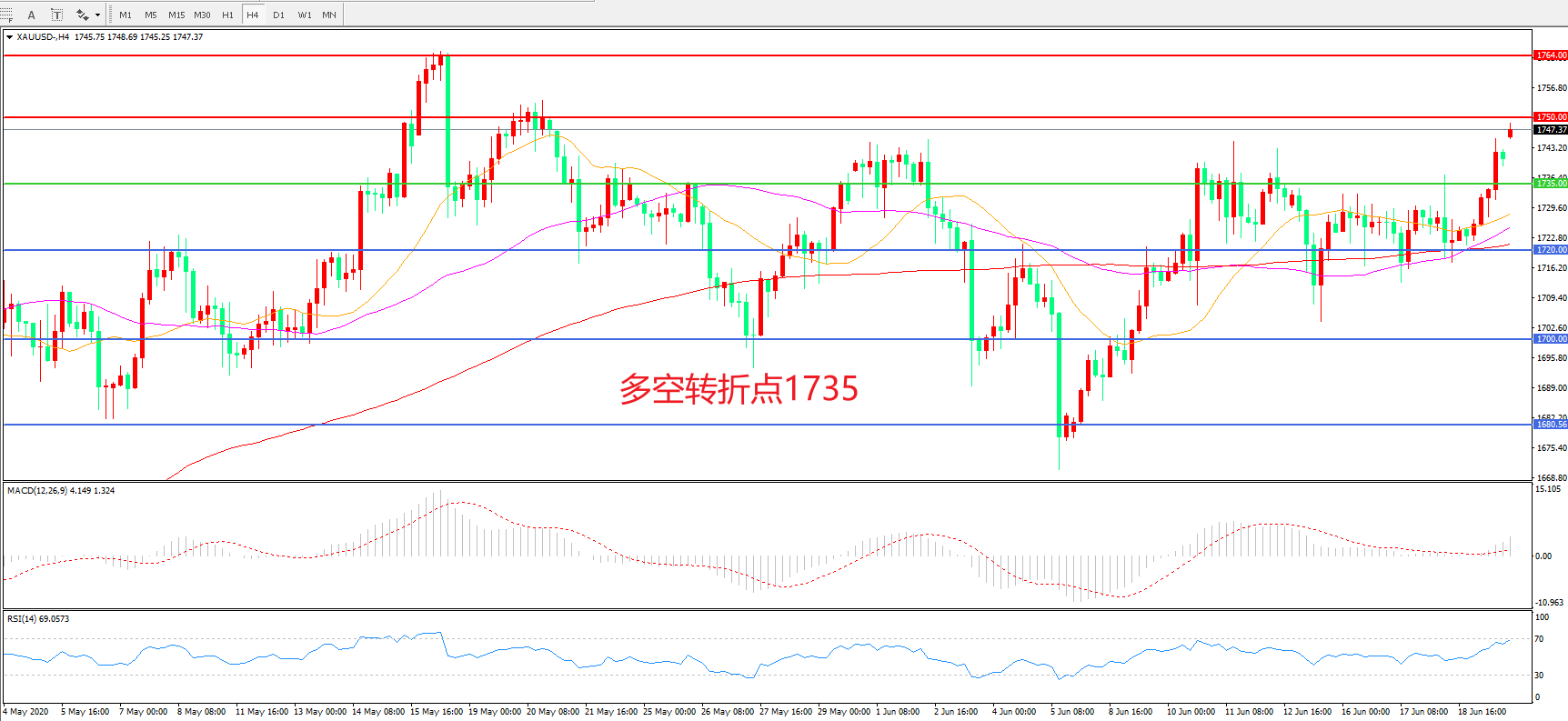 交易策略:在1735.00之上看涨,目标1750.00   1764.00