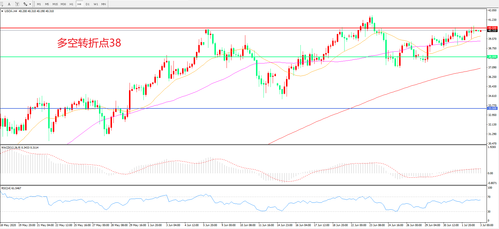 周四(7月2日),6月美国非农就业人口增加480.0万人,表现大幅好于预期和前值,提振了市场上的风险情绪,美国WTI原油延续高位震荡,收报40.22美元/桶。美国冠状病毒感染病例二度激增加剧了人们对未来济的担忧,油市需求仍然取决于防疫的进一步变化。