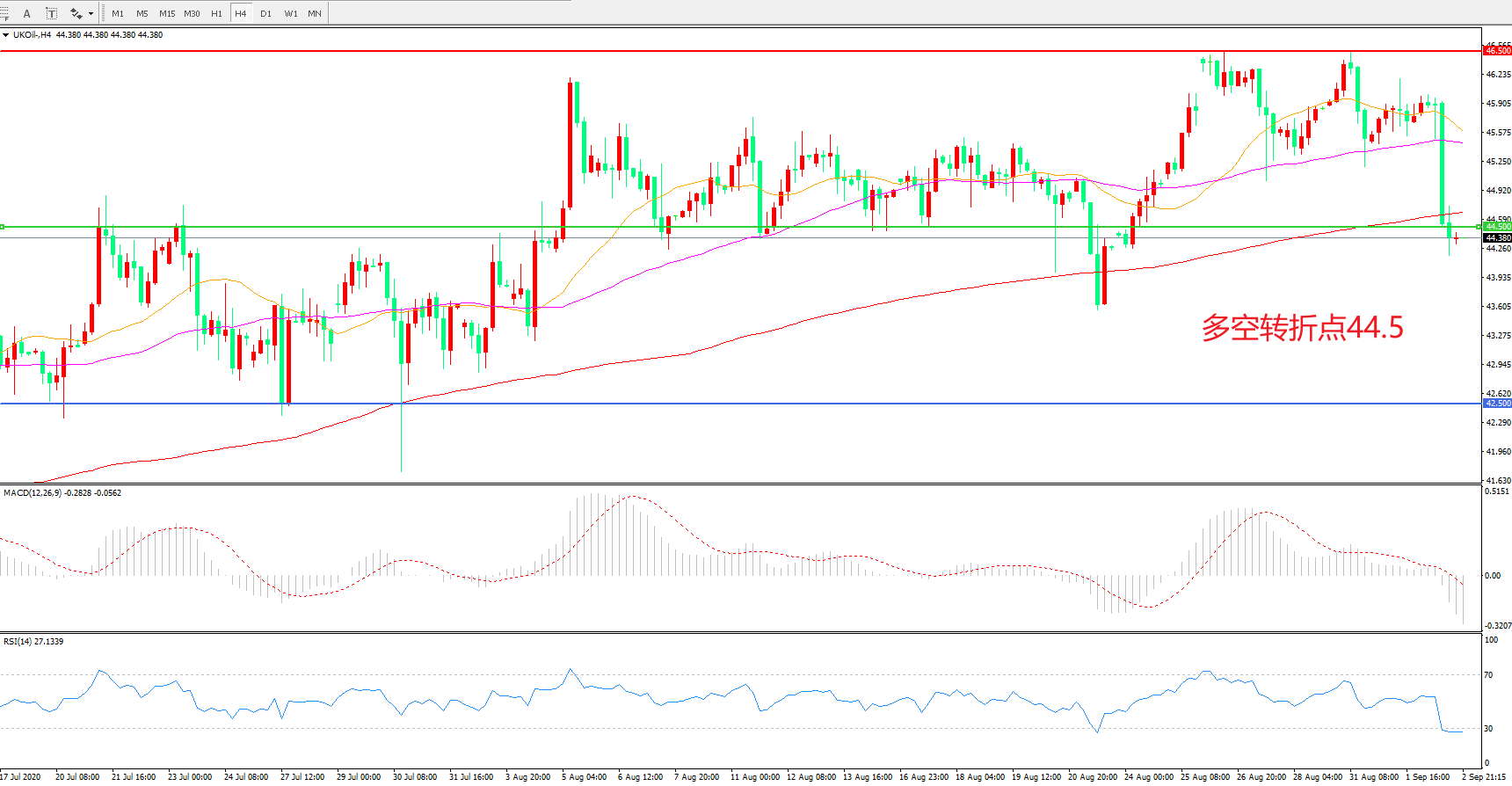 4小时图看,油价长阴下破,前期涨幅被吞噬殆尽,短期走势偏空,200周期均线被跌破,MACD绿柱增加,RSI指标走平,日内延续震荡概率较大。