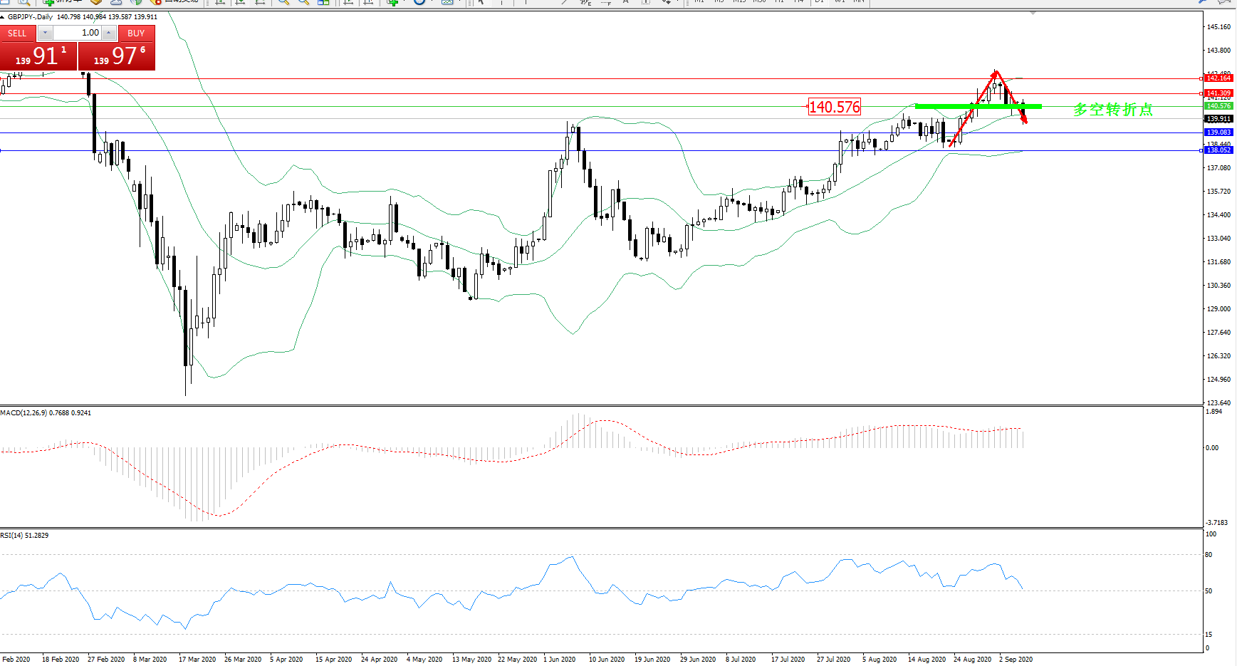 交易策略:140.576下方看跌,目标139.083、138.052