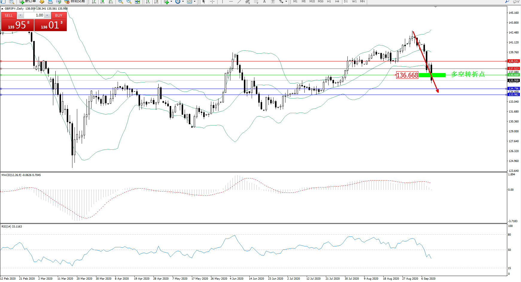 交易策略:136.668下方看跌,目标134.796、133.982