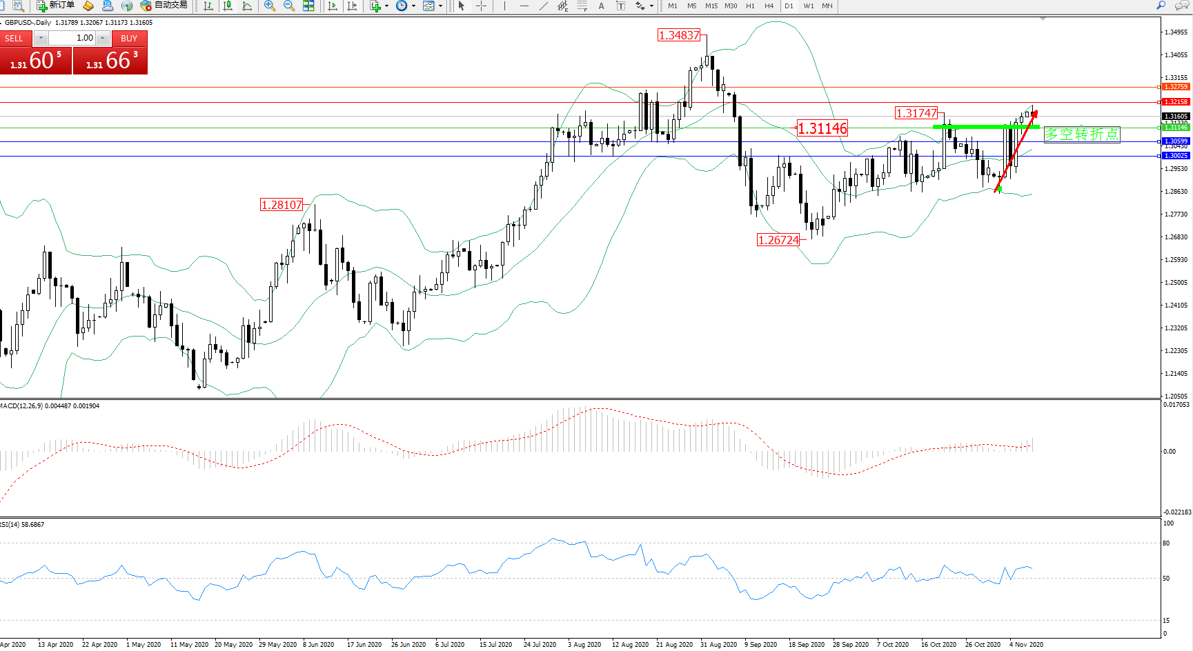 交易策略:1.31146上方看涨,目标1.32158、1.32759