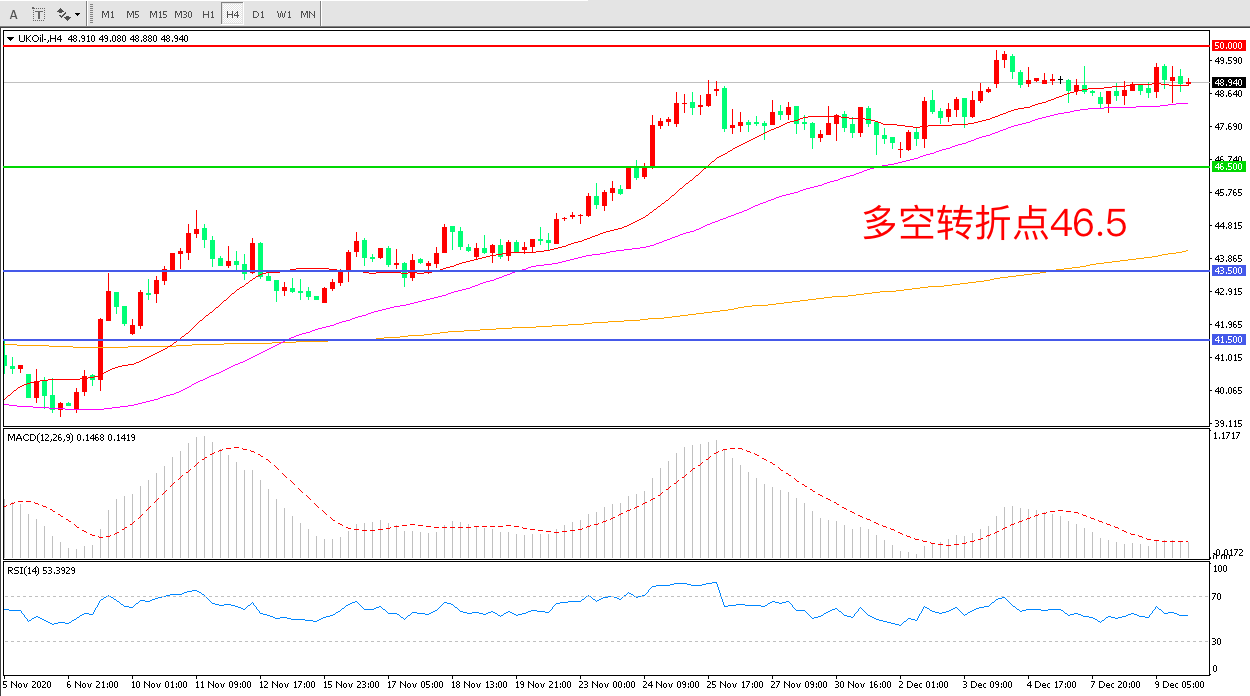 4小时图看,油价延续高位震荡,短期波幅不大55周期均线成为短期支撑50美元成为中期阻力MACD红柱减少,RSI指标走平,日内延续震荡概率较大。
