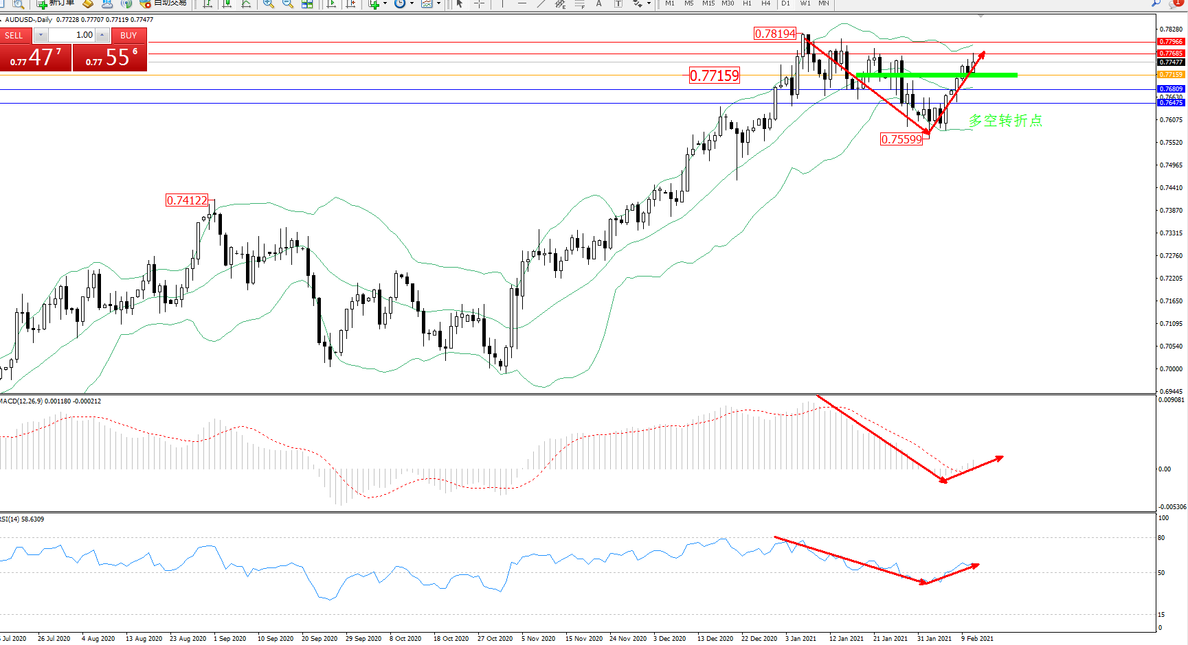 交易策略:0.77159上方看涨,目标0.77685、0.77966