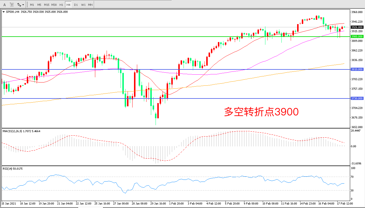 2月17日),美国零售数据优于预期,但美债收益率持续一年来高位,通胀加速回升促使央行缩减QE的担忧继续施压美股集体低开好在美联储公布会议纪要未提缩减购债,强调一段时间内政策不变,三大指数中相继转涨,标普500高位震荡后收报3926.75但大型科技股多数下跌,苹果跌近1.8%,奈飞跌1%。