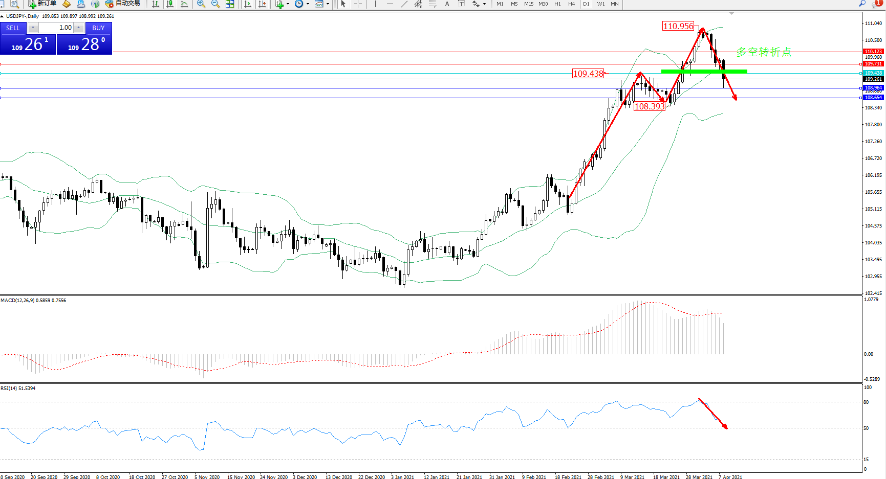 技术点评:多头动力延续布林带指标中上轨区间通道持续震荡上扬,高位抵达110.956位置遇阻回撤,跌破布林带指标中轨附近节点后有继续向下移动态势,且跌势未见最终止步迹象,布林带指标呈张口走势后开始缓慢收口,关注中轨附近节点,MACD指标处于多头区域高位震荡回撤,RSI指标高位持续回撤下行即将触及0轴线附近节点;