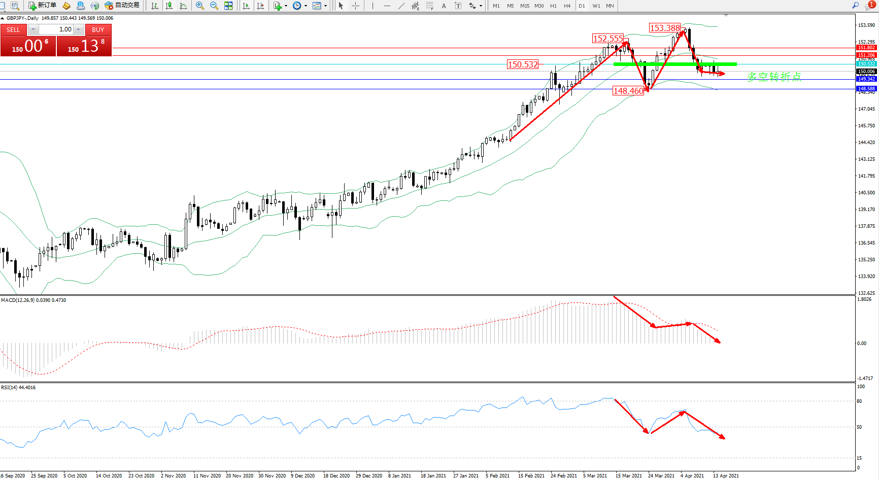 交易策略:150.532下方看跌,目标149.342、148.588