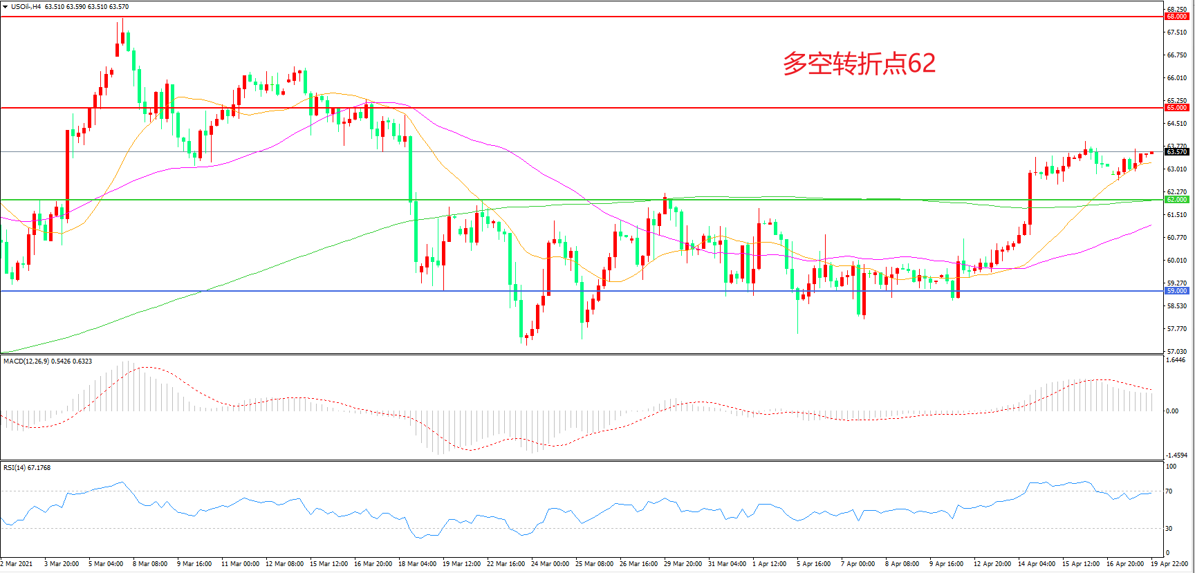 4小时图看,油价长阳拉升后延续高位震荡,整体表现偏强,21周期均线形成下方支撑,62美元成为多空分水岭,MACD红柱增加,RSI指标走平,日内延续上行概率较大。
