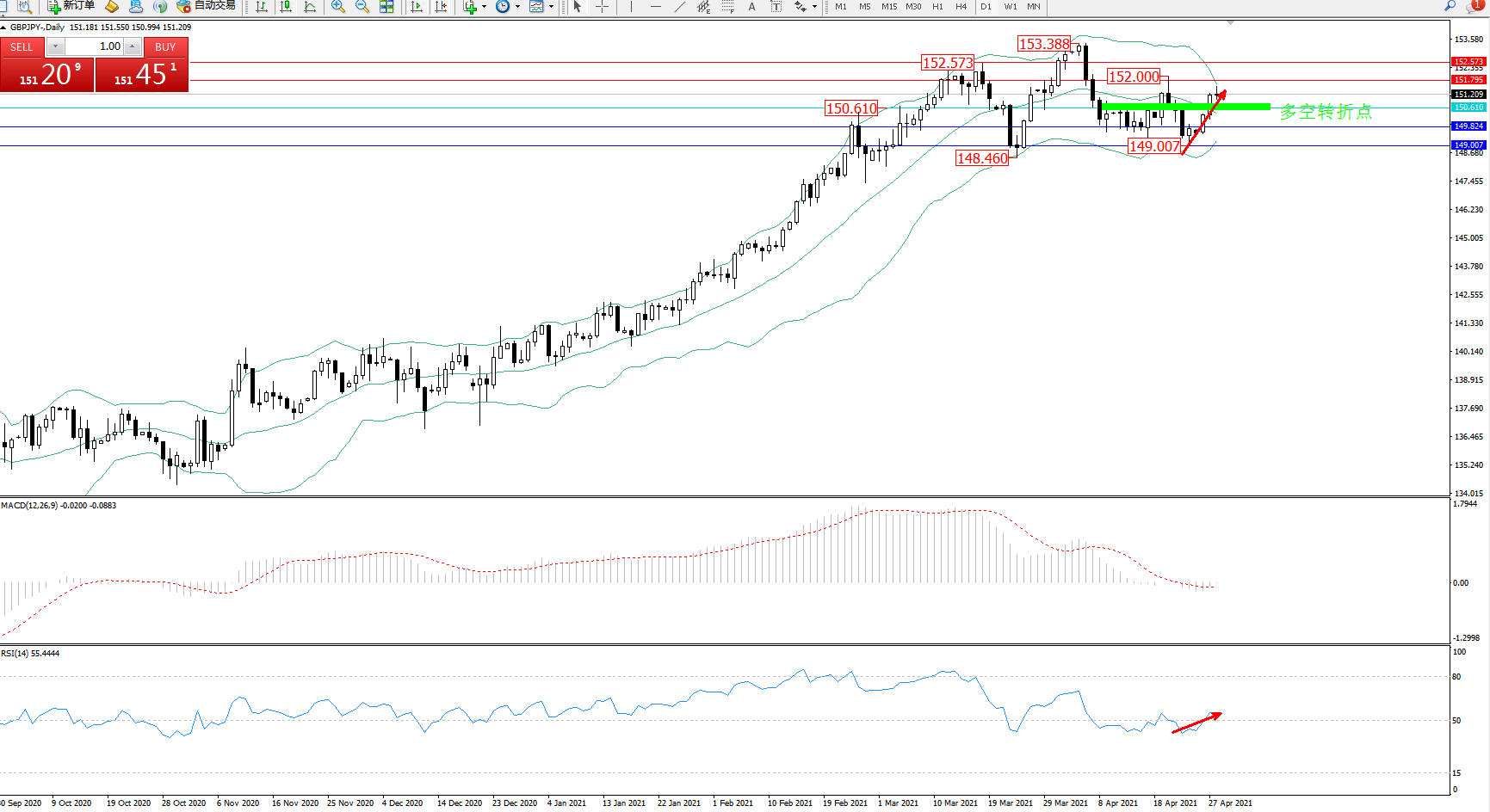交易策略:150.610上方看涨,目标151.795、152.573