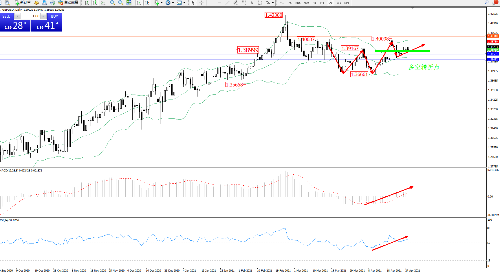 交易策略:1.38999上方看涨,目标1.39780、1.40310