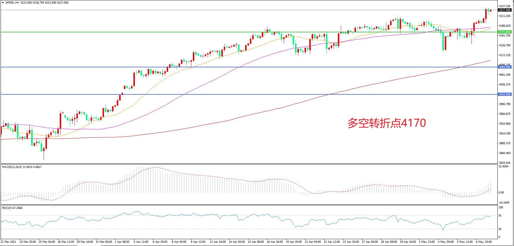 4小时图看,标普500长阳拉升,突破前期整理区间,整体表现较为强势显示,均线系统走平形成下方支撑,MACD红柱增加,RSI指标走平,日内震荡上行概率较大。