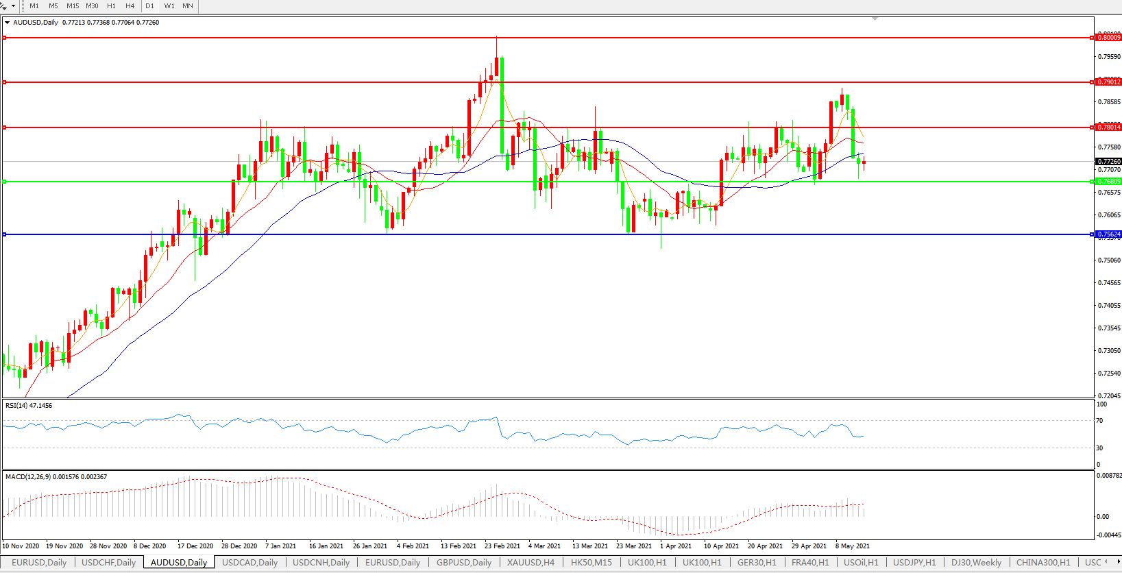 备选策略:0.7680下方看跌,目标0.7560、0.7400