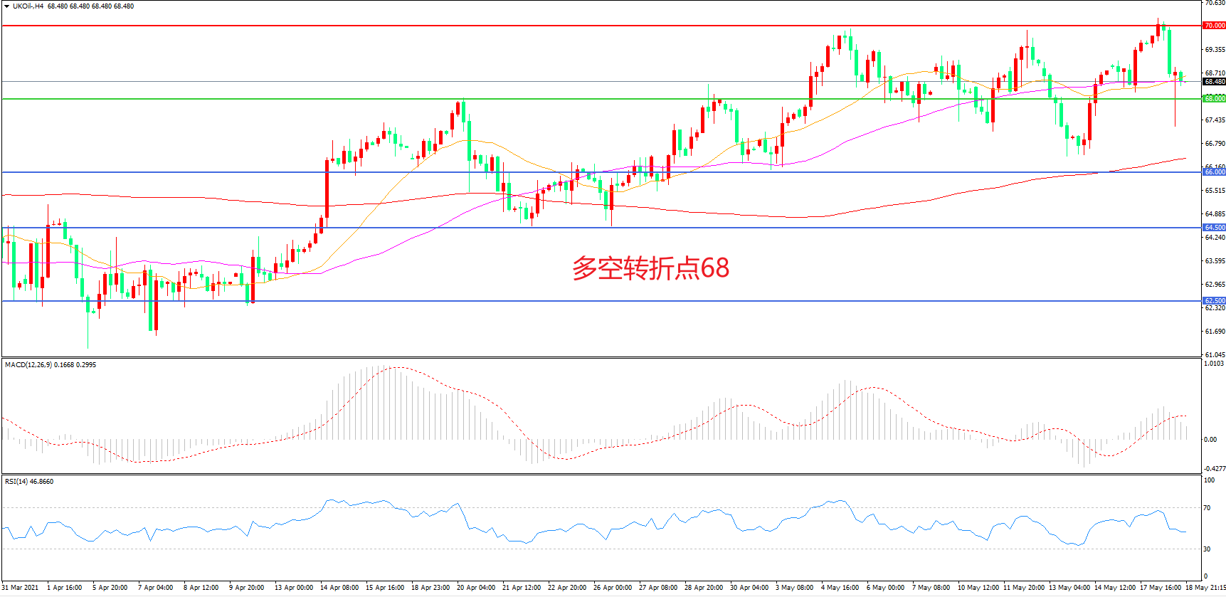 4小时图看,油价以均线系统为依托横盘整理,区间震荡迹象明显,68美元成为短线支撑,70美元成为上方阻力,MACD红缩短,RSI指标走平,日内延续震荡概率较大。