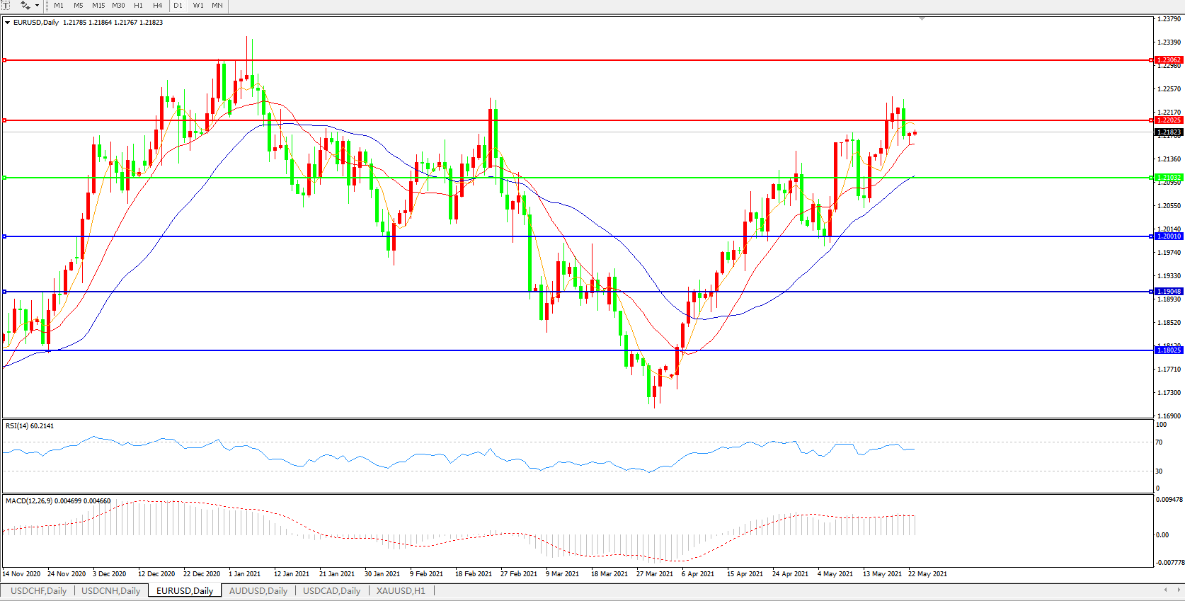 技术面简析:日图均线呈上行态势,汇价继续回测整理,MACD运行于0轴上但量能开始微缩量,RSI缓步走弱,预计短期汇价大概率将在整理后进一步上行。