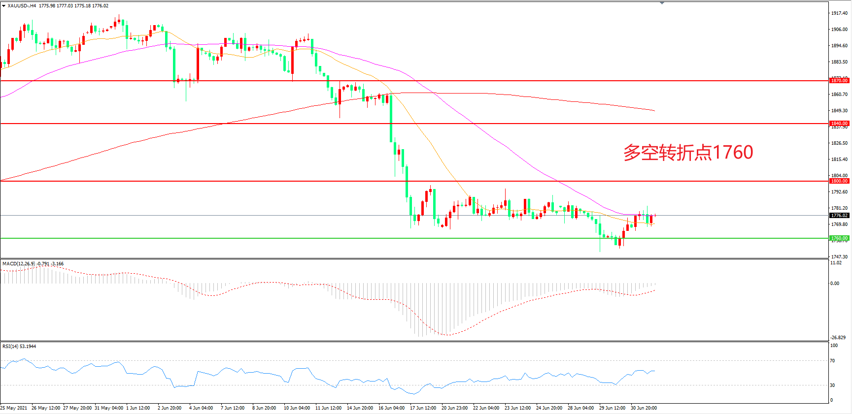 交易策略:在1760.00之上看涨,目标1800.00       1840.00