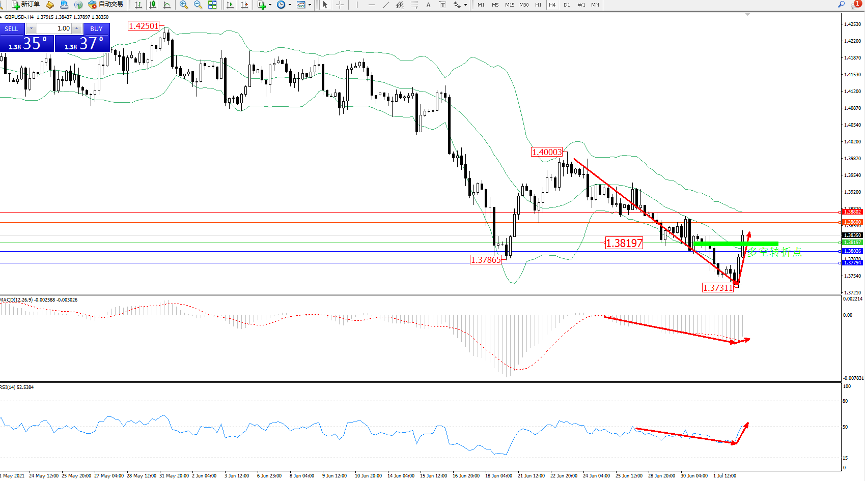 动力延续布林带指标中下轨区间持续震荡下行,低位抵达1.37311位置节点后得到支撑强势反转上扬,突破布林带指标中轨附近节点有持续攀升中,布林带指标呈下行趋势态势良好,短期或维持整理,MACD指标处于0轴线下方空头区域维持整理后有上移迹象,RSI指标处于空头区域低位维持震荡后反转上扬触及50均衡线位置开始上移;