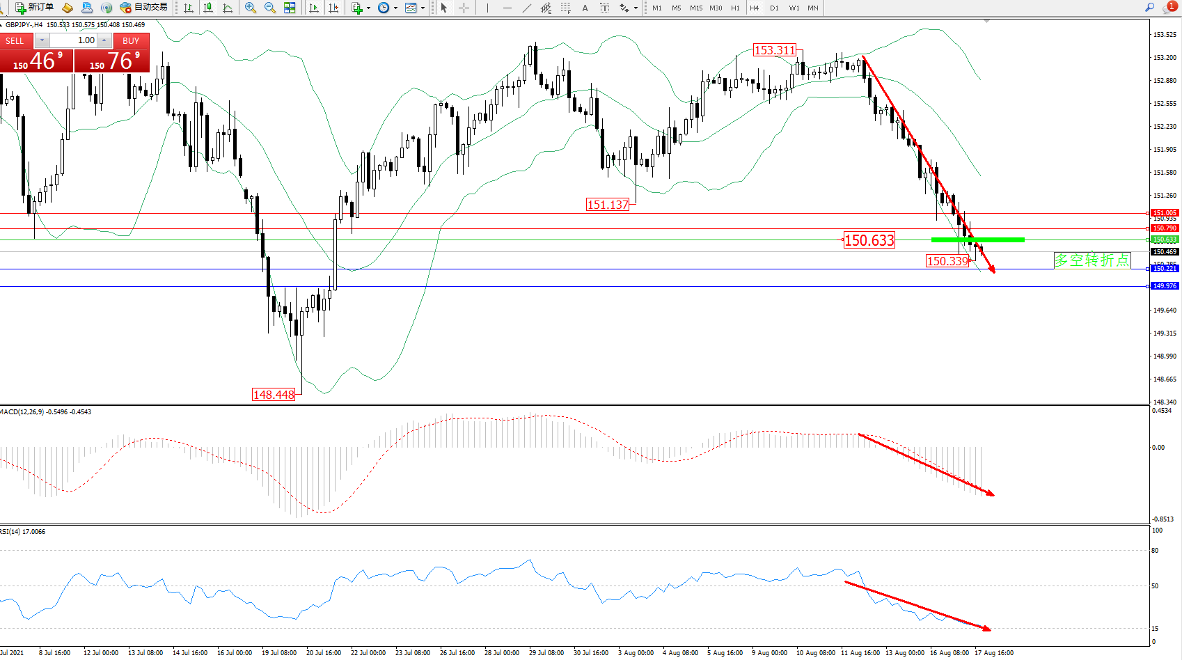 交易策略:150.633下方看跌,目标150.221、149.976