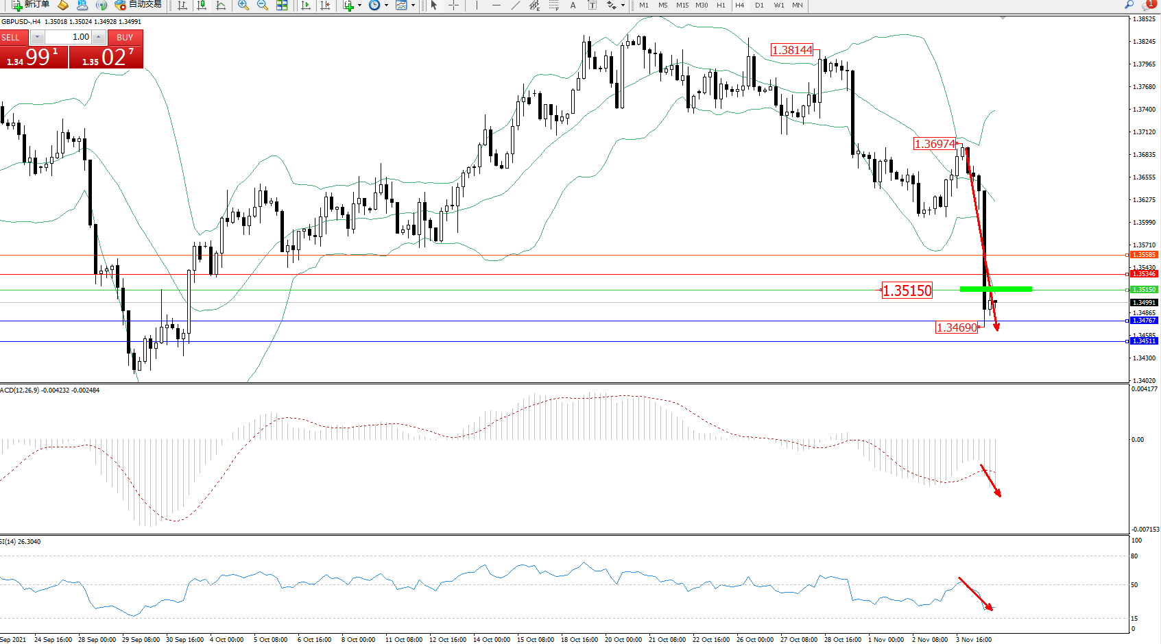 交易策略:1.35150下方看跌,目标1.34767、1.34511